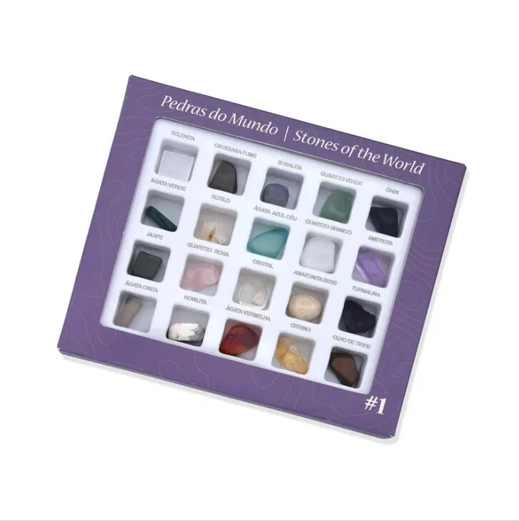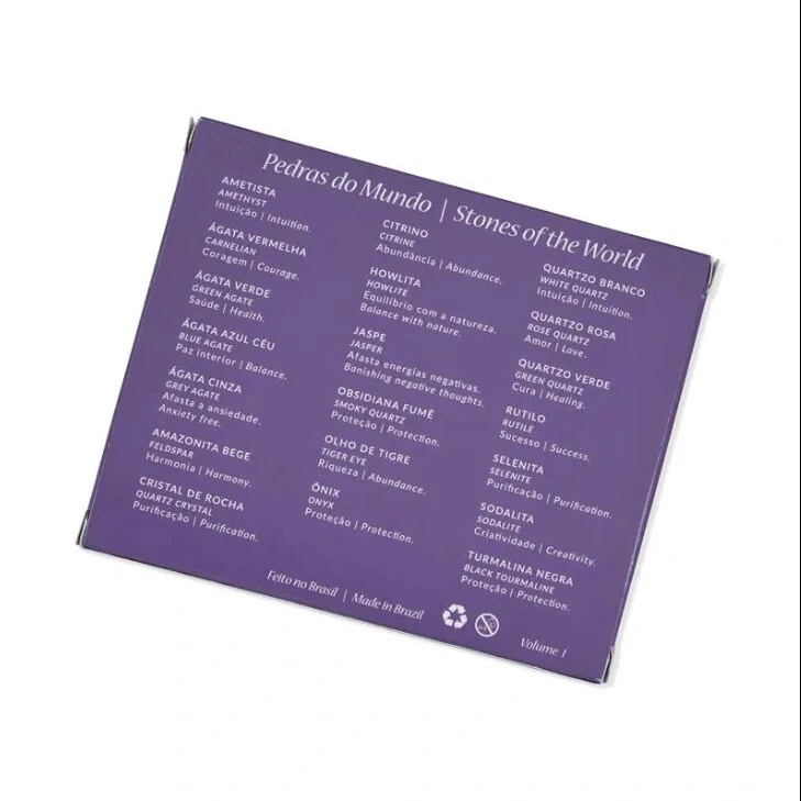 Cores: Selenita, obsidiana fumê, sodalita, quartzo verde, ônix, ágata verde, rutilo, ágata azul céu, quartzo branco, ametista, jaspe, quartzo rosa, cristal, amazonita bege, turmalina, ágata cinza, howlita, ágata vermelha, citrino, olho de tigre.