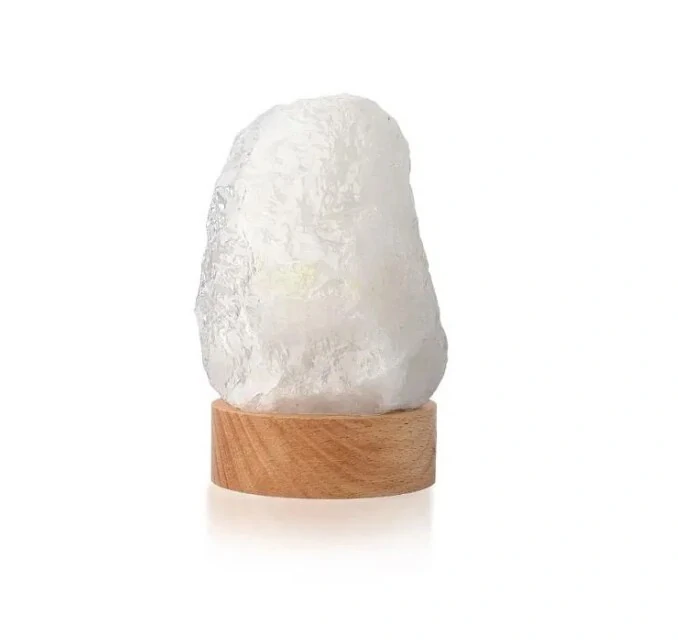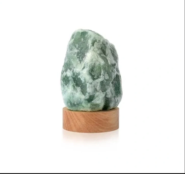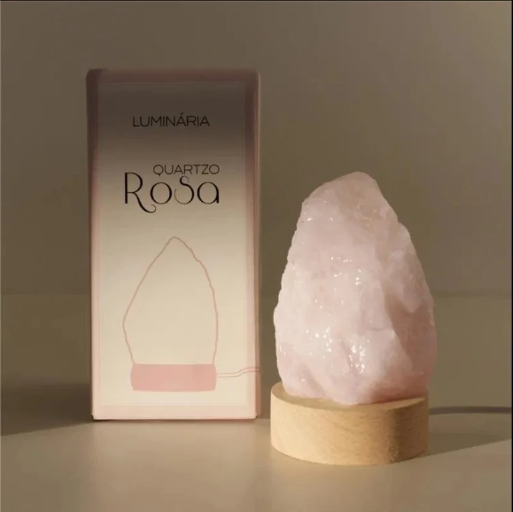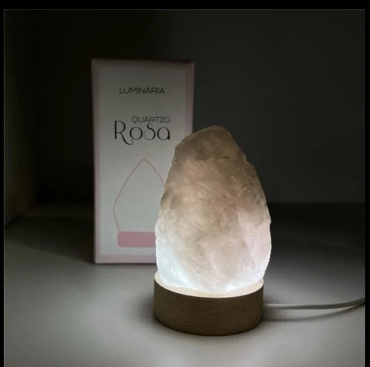 Luminária feita de pedra natural, disponível em quartzo rosa, quartzo verde e cristal de rocha.